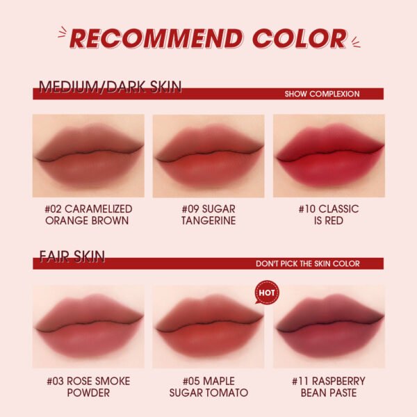 - Velvet Matte Finish: Delivers a soft, matte look without drying out the lips, providing a comfortable wear throughout the day.